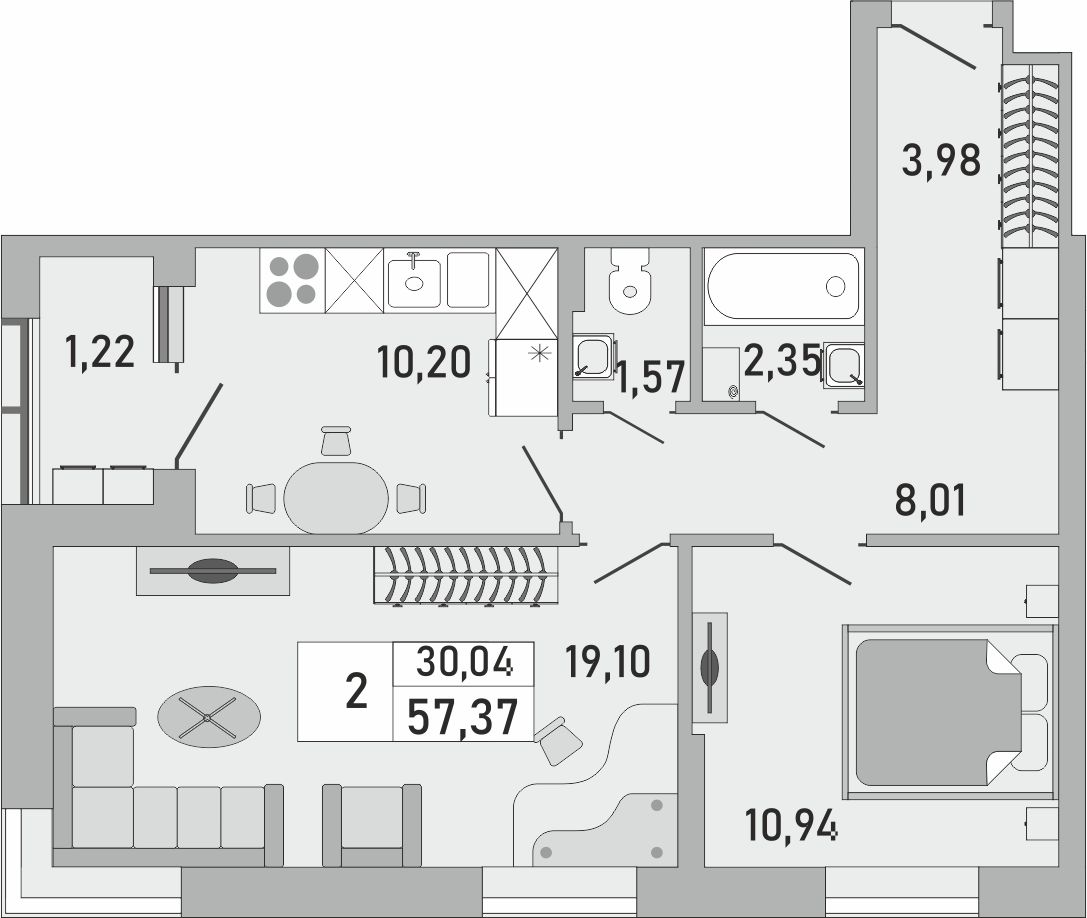 2-комнатная квартира, 57.37 кв.м